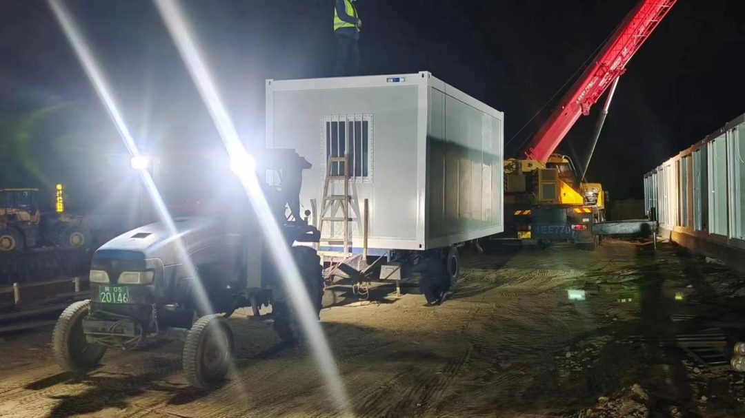 開(kāi)工初期,全國(guó)范圍內(nèi)的疫情肆虐嚴(yán)重影響了建筑材料的運(yùn)輸,各地中高風(fēng)險(xiǎn)區(qū)大量方艙醫(yī)院需求又造成了整個(gè)箱房行業(yè)的嚴(yán)重缺貨,對(duì)我司的備貨供貨能力提出了嚴(yán)峻考驗(yàn),按照潼關(guān)縣防疫政策要求,自4月8日起外地車輛和人員實(shí)行勸返政策,打包箱,門窗等重要原材料以及負(fù)責(zé)管道、電纜的施工隊(duì)伍都沒(méi)能按時(shí)進(jìn)入施工現(xiàn)場(chǎng)......面對(duì)困難,不等不靠,主動(dòng)出擊,是陜建人的鐵血作風(fēng),在雙重壓力下,項(xiàng)目負(fù)責(zé)人連夜召集相關(guān)人員召開(kāi)緊急會(huì)議集中破解難題,會(huì)議部署:一是尋求潼關(guān)縣政府相關(guān)部門協(xié)助建設(shè)物資運(yùn)輸,在不違反防疫原則,嚴(yán)格做好疫情防控的前提下,實(shí)行特事特辦,專事專辦,公司提前報(bào)備運(yùn)輸行程,制定專門的運(yùn)輸路線進(jìn)行點(diǎn)對(duì)點(diǎn)運(yùn)輸,定時(shí)定點(diǎn)消殺,嚴(yán)防因項(xiàng)目施工導(dǎo)致的疫情傳播;二是千方百計(jì)調(diào)配原材料,公司廠內(nèi)現(xiàn)有庫(kù)存原料全部用于支持潼關(guān)項(xiàng)目,剩余缺口全公司調(diào)用一切資源協(xié)調(diào),必須保障項(xiàng)目順利實(shí)施。定了就干,說(shuō)了就辦,會(huì)議精神迅速落實(shí),每個(gè)環(huán)節(jié)、每項(xiàng)任務(wù)全部精確歸責(zé)落實(shí)到人,隨著各項(xiàng)任務(wù)不斷執(zhí)行到位,項(xiàng)目建設(shè)開(kāi)啟了“加速鍵”, 4月9日早上6點(diǎn),打包箱材料運(yùn)到了現(xiàn)場(chǎng),早上7點(diǎn),專業(yè)的施工隊(duì)伍到達(dá)現(xiàn)場(chǎng),當(dāng)日,第一批材料也及時(shí)到達(dá)現(xiàn)場(chǎng),同時(shí)抵達(dá)的還有從行業(yè)內(nèi)調(diào)配的整套箱房材料,4月10日凌晨,施工現(xiàn)場(chǎng)燈火通明,塔吊林立,機(jī)器轟鳴,箱式房吊裝作業(yè)正式啟動(dòng),四月的深夜依然寒意凜凜,但每個(gè)參建者卻汗流浹背,斗志昂揚(yáng)......