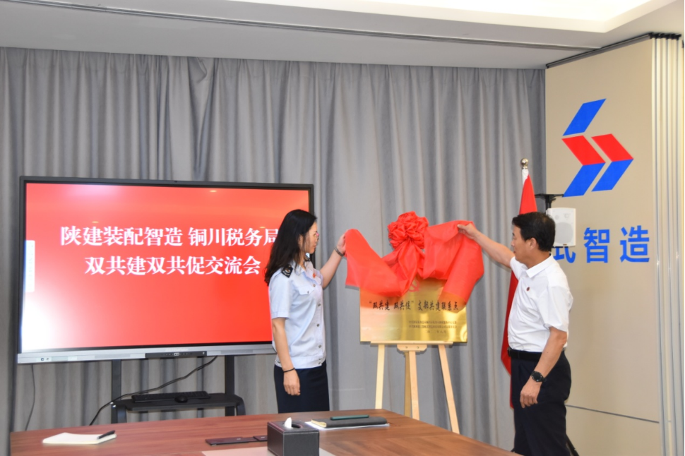 銅川稅務(wù)局納稅服務(wù)中心黨支部書記郭秀梅、陜建裝配智造公司黨支部書記王輝共同為“雙共建 雙共促支部共建聯(lián)系點”揭牌