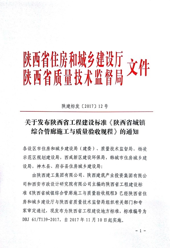 近日,由陜建投資集團主編的《陜西省城鎮(zhèn)綜合管廊施工與質(zhì)量驗收規(guī)程》經(jīng)陜西省住房和城鄉(xiāng)建設(shè)廳與陜西省質(zhì)量技術(shù)監(jiān)督局批準(zhǔn)發(fā)布,標(biāo)準(zhǔn)編號為DBJ 61/T139-2017,自2017年11月10日起實施。這是陜建投資集團在編寫工程建設(shè)地方標(biāo)準(zhǔn)方面取得的一項重要科研成果,充分顯示了集團在城鎮(zhèn)綜合管廊領(lǐng)域的綜合技術(shù)實力。